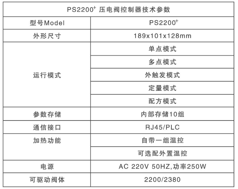 可精准控制驱动模块的打开,关闭,行程,时间的脉冲控制。PS 2200+采用触控一体液晶屏,界面简洁易,可根据输入多个控制参数对工作过程精准配置。控制器及驱动模块内置计数器功能,实时监控使用寿命,通过计数进度条显示胶阀使用状态,内置网络通讯口,胶阀状态读取及参数调整可由上位机执行操作。可存储10组点胶参数。配方功能,可建过外部I/O调用。内置一组温控功能,可根据实际需求配置。