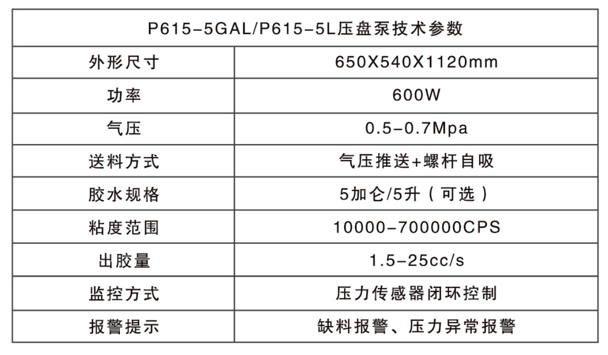容器内高粘度材料直接增压点胶的装置;直接使用装有材料的容器上料,防止气泡混入及异物污染,使用气动压盘供胶,螺杆送胶,同时配备压力感应器闭环控制始终保证供胶压力的一致性;适用材料:润滑脂\导热脂\环氧树脂\硅胶\其它高粘度材料